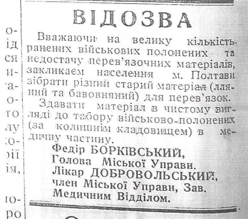 Также Борковский основал в Полтаве и области отделение Украинского Красного Креста и госпиталь для раненых и больных красноармейцев. Правительство их покинуло, но нашлись и те, кто о них позаботился. Борковский неоднократно публиковал в газете “Голос Полтавщины” просьбу собрать для пленных хоть какие-то продукты, одежду, обувь и лекарства. Сами же полтавчане радостно помогали ему, потому что уважали мэра и искренне сочувствовали пленным.