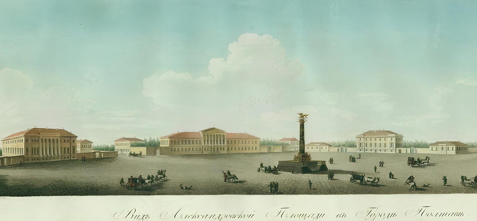 Посреди Круглой площади, которую чуть позже стали называть Александровской, установили памятник, посвященный судьбоносному событию, произошедшему в 1709 году – неподалеку от города грохотала знаменитая Полтавская битва. А спустя 100 лет по распоряжению местной власти воздвигли 10-метровую чугунную колонну с бронзовым орлом на самом верху. Как и архитектурный ансамбль, монумент стал одним из символов Полтавы.